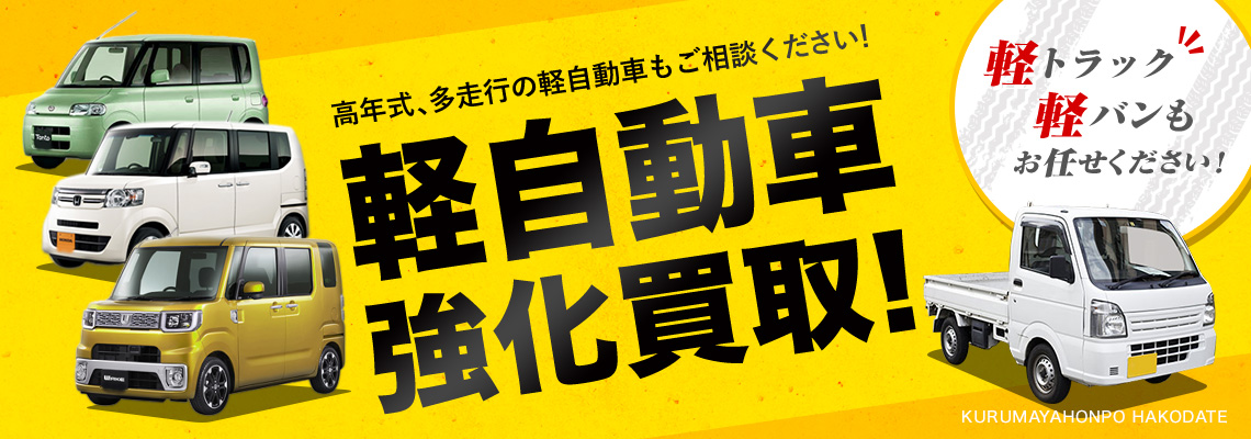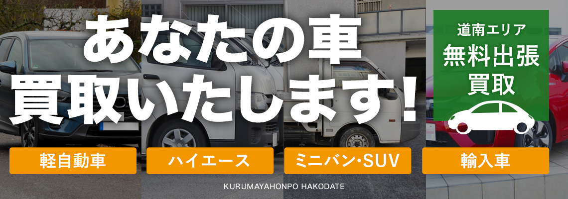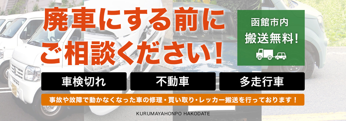 年式が古い・走行距離が多い・車検切れ・キズ、凹みや事故車等のお車もくるまや本舗函館にご相談ください!通常のディーラーや車屋では買い取りできないような車も、豊富な買取実績を持つくるまや本舗函館なら買い取りさせて頂きます!さらにその場で即日現金買取も可能!売却時の面倒な手続きもお待ちください!「どこに頼めばいいか解らない」、「買い取ってくれないだろう」と諦める前にまずはくるまや本舗函館にご連絡ください!